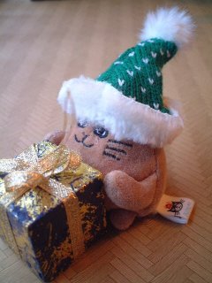 Mr Cat's Christmas hat came attached to a knitted stocking and a slightly unsettling elf head thing. And some candy letters.