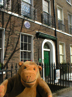Mr Monkey scampered along Doughty Street, which used to have gates at each end to keep people out. Charles Dickens lived at number 48 from March 1837 to December 1839. His published works while he lived here included the last six parts of the Pickwick Papers, all of Oliver Twist and Nicholas Nickleby, and a few chapters of Barnaby Rudge. Mr Monkey inspected the blue plaque to be sure he'd got the right place, then rang the door bell and went into the house.