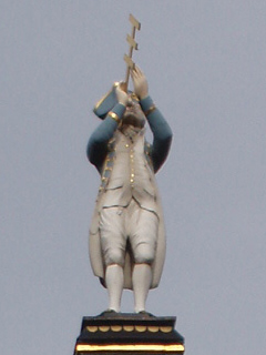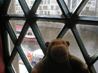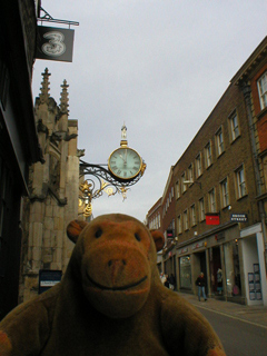 Mr Monkey left his luggage at his hotel and scampered into York. He stopped for a snack at a cafe in one of the turrets on Lendal Bridge. Looking out of the side window he noticed a bright red tour boat going past, and decided he'd have a trip on the river before going home. Then he set off down Coney Street. On the way he admired the figure of the Little Admiral standing on top of the clock of St Martin le Grand, who stayed in place when the church was bombed during the war.