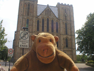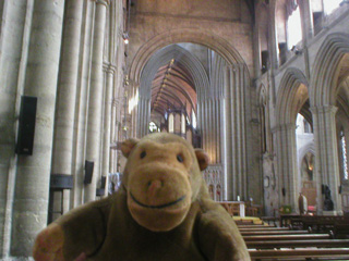 Mr Monkey crossed the road and went into Ripon Cathedral. They're working on the roof, and have put some kind of plastic sheeting up, so the front looks oddly square. If you look carefully at the crossing at the end of the nave, you can see that the pillar on the left is different from the pillar on the right, and that the arch doesn't connect properly. This is because an earthquake damaged the original crossing, and they never finished replacing them