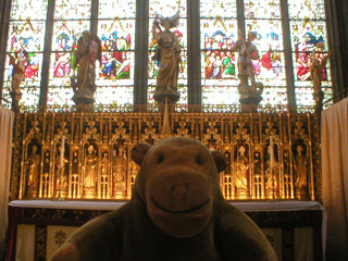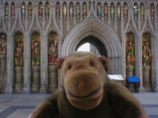 Mr Monkey found a lot of statues of figures from the cathedral's history on the pulpitum, which divides the chancel from the rest of the building. These were all put there in 1947, as the earlier figures were destroyed in the 16th and 17th centuries. And there were more statues on the 1923 reredos behind the high altar.