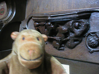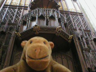 In the choir, Mr Monkey found this misericord, showing a gryphon and a rabbit, which possibly inspired Lewis Caroll (whose father worked at the cathedral). Mr Monkey was also intrigued by the wooden hand attached to the organ loft, which allowed the organist to make gestures at the choir without turning to look at them.