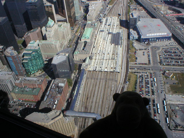 Mr Monkey scampered around to look out of the eastern, darker, side of the tower. Mostly he saw Union Station, which takes up a lot of space with all its tracks. Opposite the station he noticed the Fairmont Royal York hotel, which he was planning to move into later in the week. On the other side of the railway tracks, the flat grey building is the Air Canada centre, home of the Maple Leafs and the Raptors.