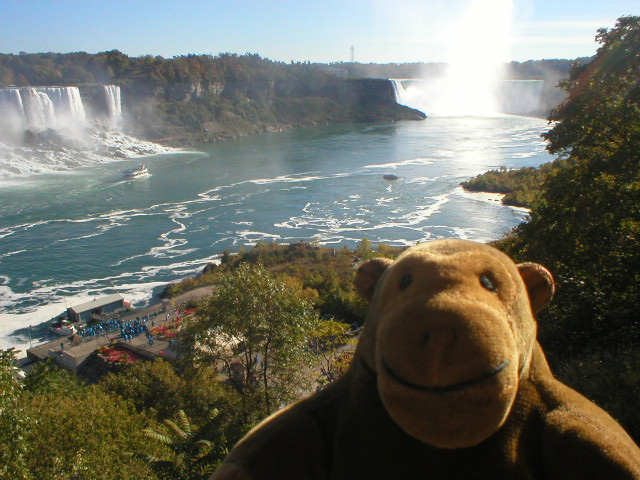 Mr Monkey looked down the river to see the Canadian base of the Maid of the Mist, and the Horseshoe Falls in the distance. A little further on, he got a better view of the American Falls, and watched a Maid of the Mist go past them. It's 182 feet from the crest of the American Falls to the river, but all the bits of rock that have fallen off mean that, in places, the water only falls 70 feet interupted