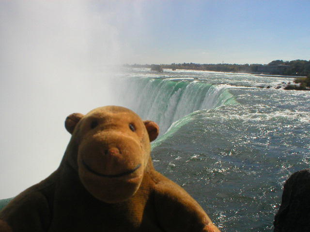 Eventually, Mr Monkey got right to the edge of the Horseshoe Falls, where he could see how clear the tumbling water was. He was struck by the the beauty of the different colours in the water, which looked like molten glass. He was also impressed by the thought that 600,000 gallons of water go over the fall every second.