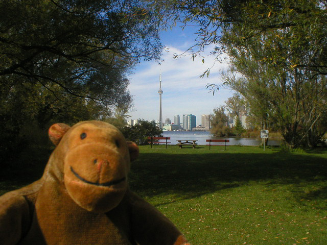Mr Monkey scampered along Cibola Avenue to get back to the ferry terminal, but he did stop a couple of times to look at the beautiful trees of Ward's Island, and to look at Toronto through a gap in the treeline.