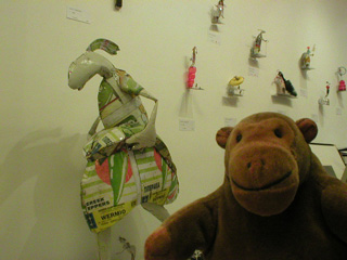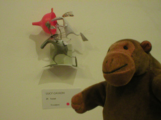 Mr Monkey scampered into Westminster Arcade on Parliament Street, to visit the Godfrey and Watt gallery and see an exhibition of work by Lucy Casson. Mr Monkey was really taken with the little scurrying metal creatures, and used his monkey powers to persuade his humans that they needed one. So now there's a part of the exhibition with a red spot that belongs to Mr Monkey. There are lots of excellent ceramics, glass and prints in the gallery as well, but they didn't have a bright yellow sign about them in the street.