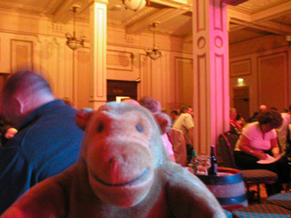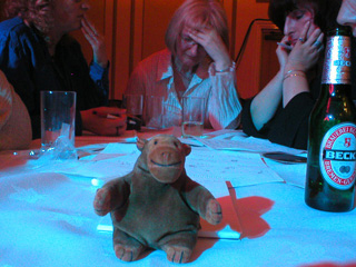 On Saturday evening, there was a Crime quiz, where teams had to answer questions about crime books, identify TV theme tunes, and recognize the backs of writer's heads. Mr Monkey's humans joined a team with Ms Karen, Ms Gaynor, Ms Donna and Ms Luci. The team mysteriously became named the Orange Monkey All Stars, and came second by only one point to the Vodka Shots who were all more or less professionals. Obviously, Mr Monkey could have told them the answers to get an extra point or two, but that would have meant there were seven people on the team, and there'd have been consequences.