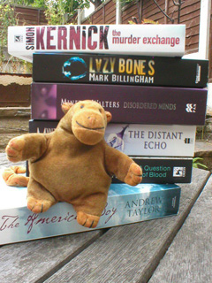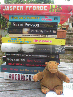 When he got home on Sunday afternoon, Mr Monkey dragged all his new books outside, and divided them into the ones he'd bought or got in a goodie bag, and the six books (the shortlist for the Theakstons prize) he won for coming second in the quiz. Then he realised it was foolish keeping books in the back garden, what with all that weather, and took them back inside to settle down and read.