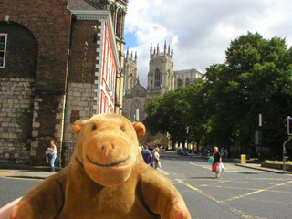 Down the slope from the dangerous assembly of owls, Mr Monkey found the hospitium of St Mary's Abbey. This was built in the 14th century to give visitors to the abbey, which is now completely ruined, somewhere to sleep. Mr Monkey left the Museum Gardens and carried on along Museum Street, getting a good view of a bit of York Minster as he did. It looked very like a cathedral.