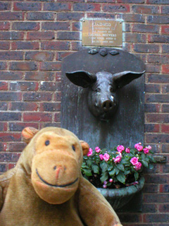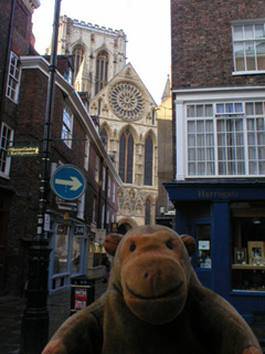 Looking for somewhere to eat in the narrow streets in the pedestrianised centre of York, Mr Monkey caught occasional glimpses of the Minster and met Leadwig the Swinegate Pig, who is fixed to a wall on Swinegate.