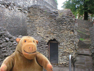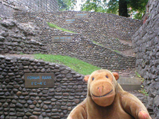 Mr Monkey found a little doorway, slipped through it, and found the Anglian Tower he was looking for. This was built between the Roman and medieval periods, and was excavated, along with bits of Roman wall, in the early 1970s by Jeffrey Radley, who died in an accident on the site. Mr Monkey looked carefully at the stonework of the Roman walls, the medieval wall behind the Roman wall, and the Anglian tower, and decided the Anglians didn't really know much about building with stone. Then he looked at the demonstration of outlines of the bank beneath the wall in the Roman, Dark Age, Norman and medieval periods