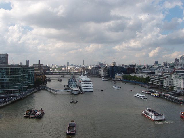 Mr Monkey scampered into the western walkway of the bridge. From there he was able to look up the river towards the city, and down towards the the Tower of London. He was able to spot that the ship parked next to HMS Belfast was the Silver Cloud of Nassau. Then he took a lift down to the ground floor.